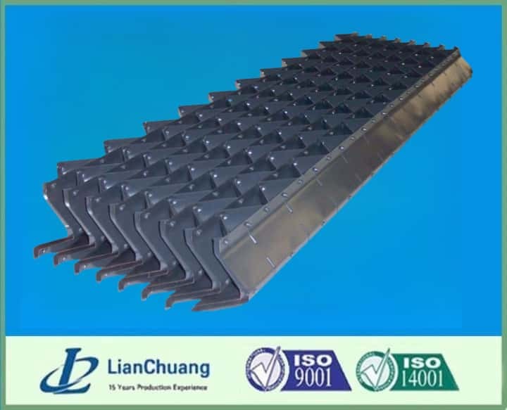 The Counterflow CF150 Cellular Drift Eliminators are designed with a discharge angle that is crucial for cooling tower performance, leading to the development of separate designs for crossflow and counterflow towers. Tests confirm that the air direction exiting the cooling tower drift eliminator plays a significant role in system efficiency—flawed designs may increase fan workload, leading to higher fan horsepower requirements or decreased cooling tower performance. The crossflow version is equipped with drainage slots to ensure that trapped drift is directed back to the wet side of the cooling tower.